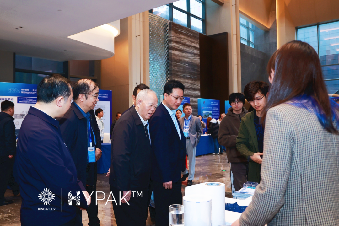 On March 28th, the Kingwills Advanced Materials booth welcomed visitors including Cao Xianghong, an academician of the Chinese Academy of Engineering, and Cong Rinan, chairman of the Professional Committee for Medical Polymer Products of the China Association for Medical Devices Industry, who introduced the development history and unique performance advantages of Hypak™ materials to Academician Cao Xianghong. Academician Cao affirmed the R&D achievements of Kingwills Advanced Materials and expressed anticipation for the future application of Hypak™ materials. Hypak™ materials combine contradictory properties such as waterproof and breathable, lightweight and high-strength, and have characteristics such as tear resistance, puncture resistance, bacterial and dust barrier, and clean peeling, making them widely used in different types of sterile barrier systems.